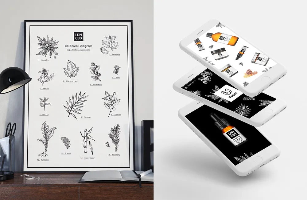 Beyond their core product line, we also collaborated on branding for three additional product lines within their portfolio, ensuring a cohesive and elevated identity across their offerings. As part of their evolution, we helped them transition to more sustainable packaging solutions, which included the creation of unique, anatomy-inspired botanical illustrations that reflected the ingredients in their LDN CBD range. While these designs were a small part of the story, they exemplified our belief in blending creativity with purpose.